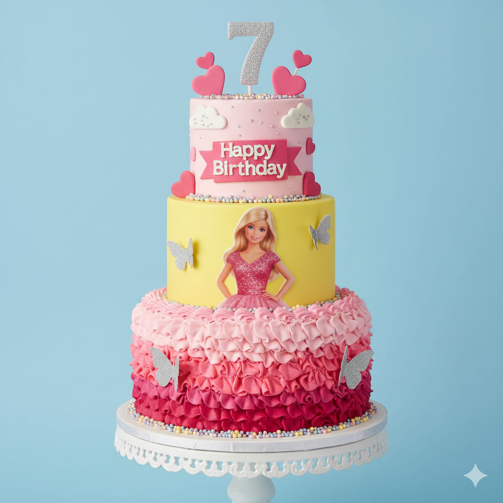Blush Gown Delight Cake is an elegant semi fondant creation featuring a princess topper, soft blush tones, and delicate gown details—perfect for a magical, princess-themed birthday celebration.