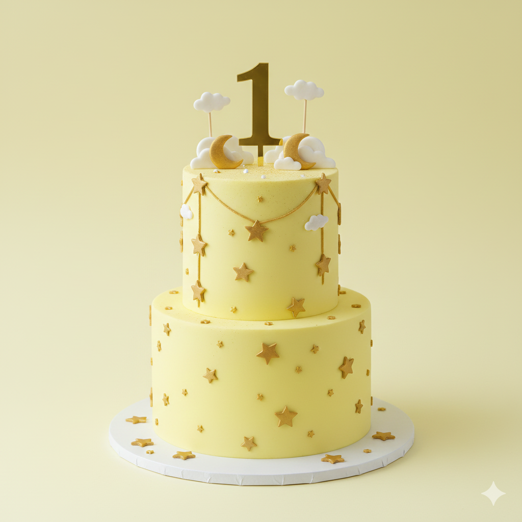 A dazzling One Star Birthday Cake with soft, moist sponge and smooth fondant finish, decorated with a sparkling star motif, perfect for birthdays, baby milestones, or special celebratory moments.
